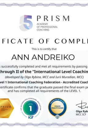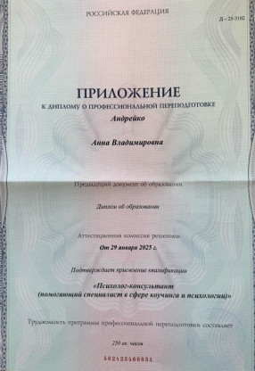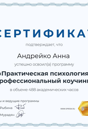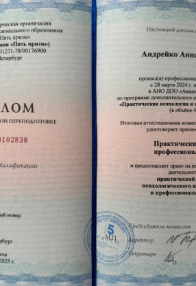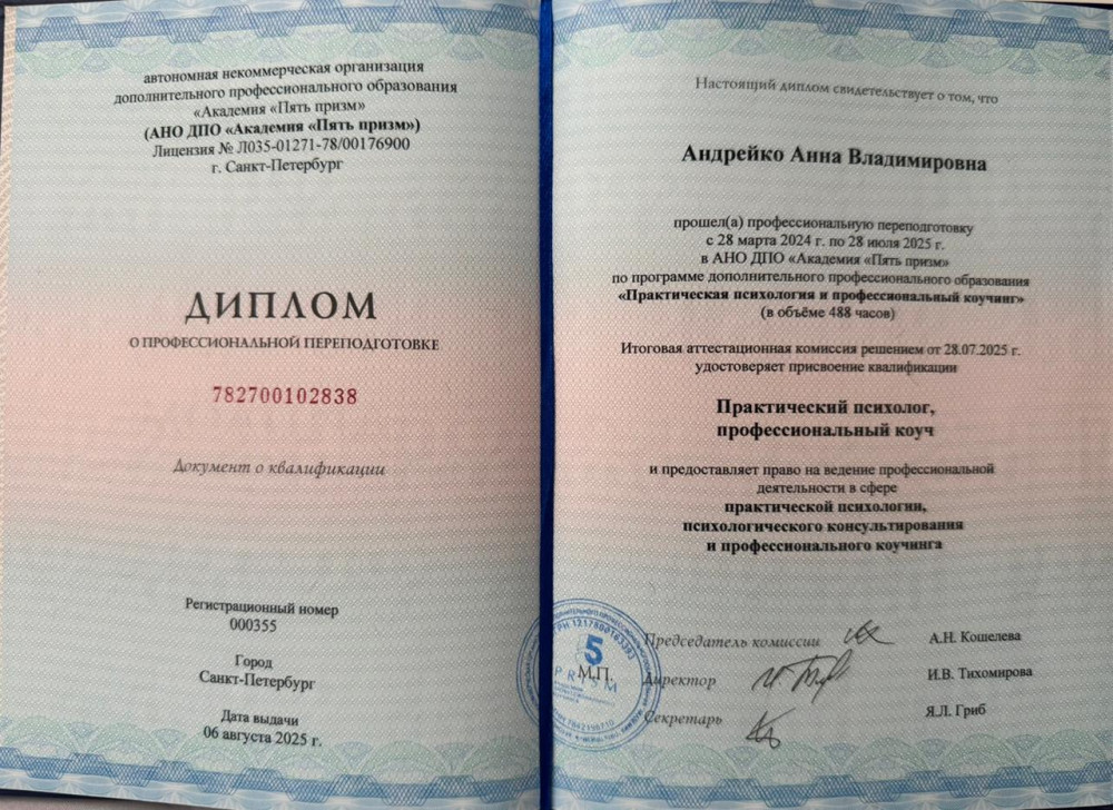 Диплом о профессиональной переподготовке "Практическая психология и профессиональный коучинг""