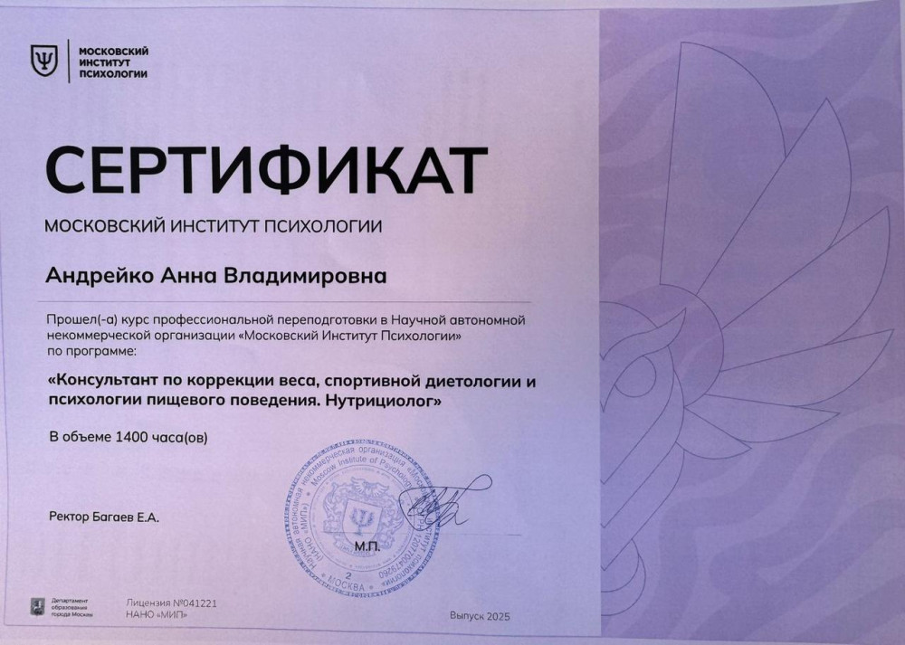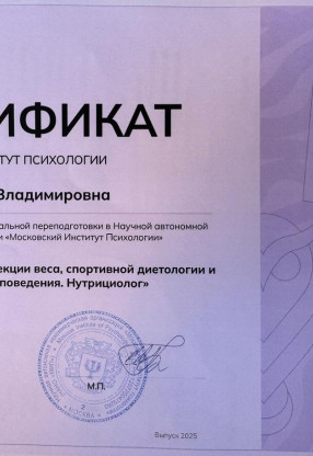Сертификат Московского института психологии "Консультант по коррекции веса, спортивной диетологии и психологии пищевого поведения. Нутрициолог"