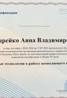 Удостоверение о повышении квалификации "Игровые технологии в работе помогающего практика"