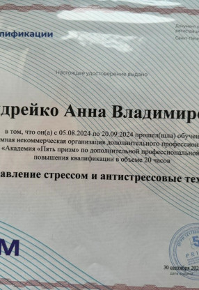 Удостоверение о повышении квалификации "Управление стрессом и антистрессовые техники"